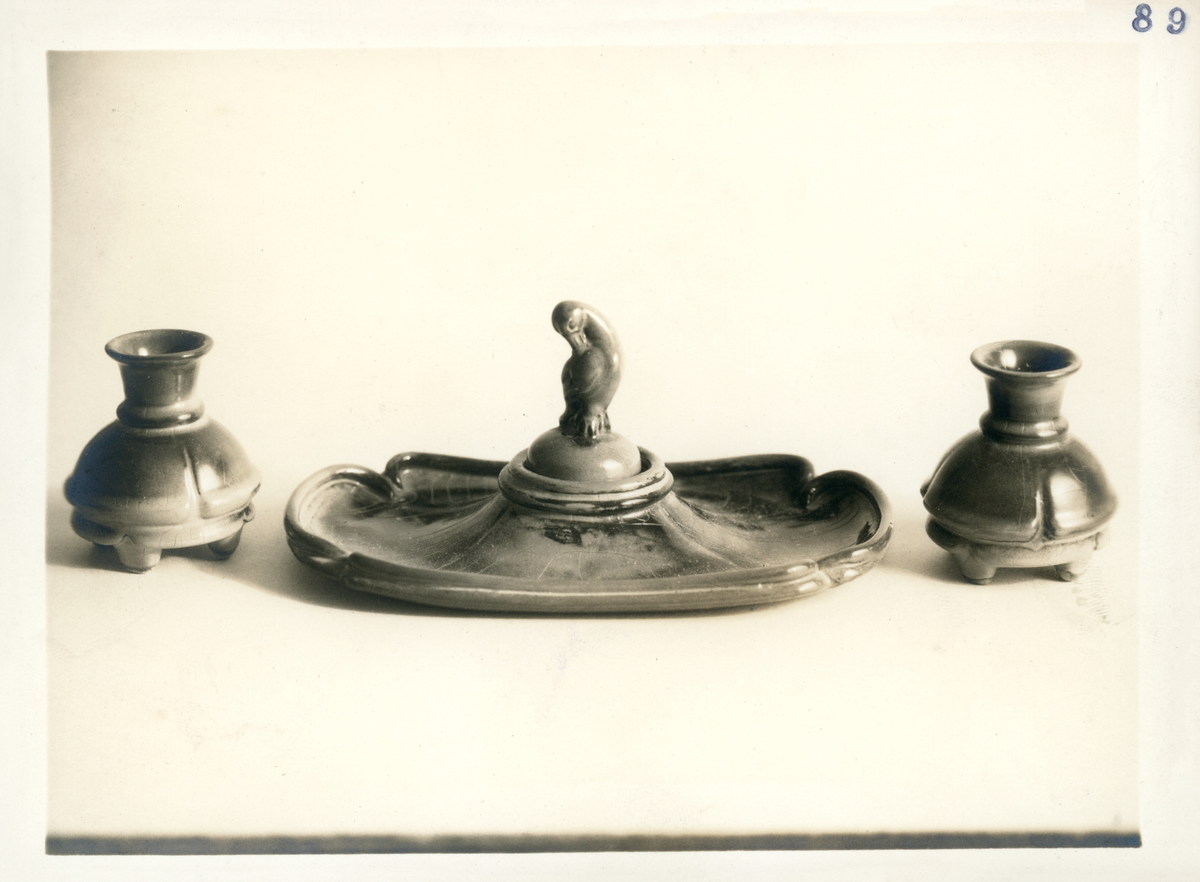 Bläckställ modell 4215 L och två ljusstakar modell 4201 L från Bo Fajans, formgivare Maggie Wibom tidigt 1900-tal.