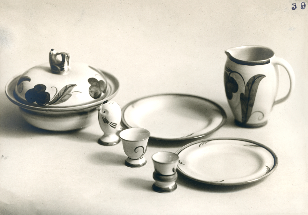 Servis från Bo Fajans, tidigt 1900-tal. Äggkarott dekorerat med en tupp, saltkar i from av en topp, två äggkoppar, två assetter samt en tillbringare.
