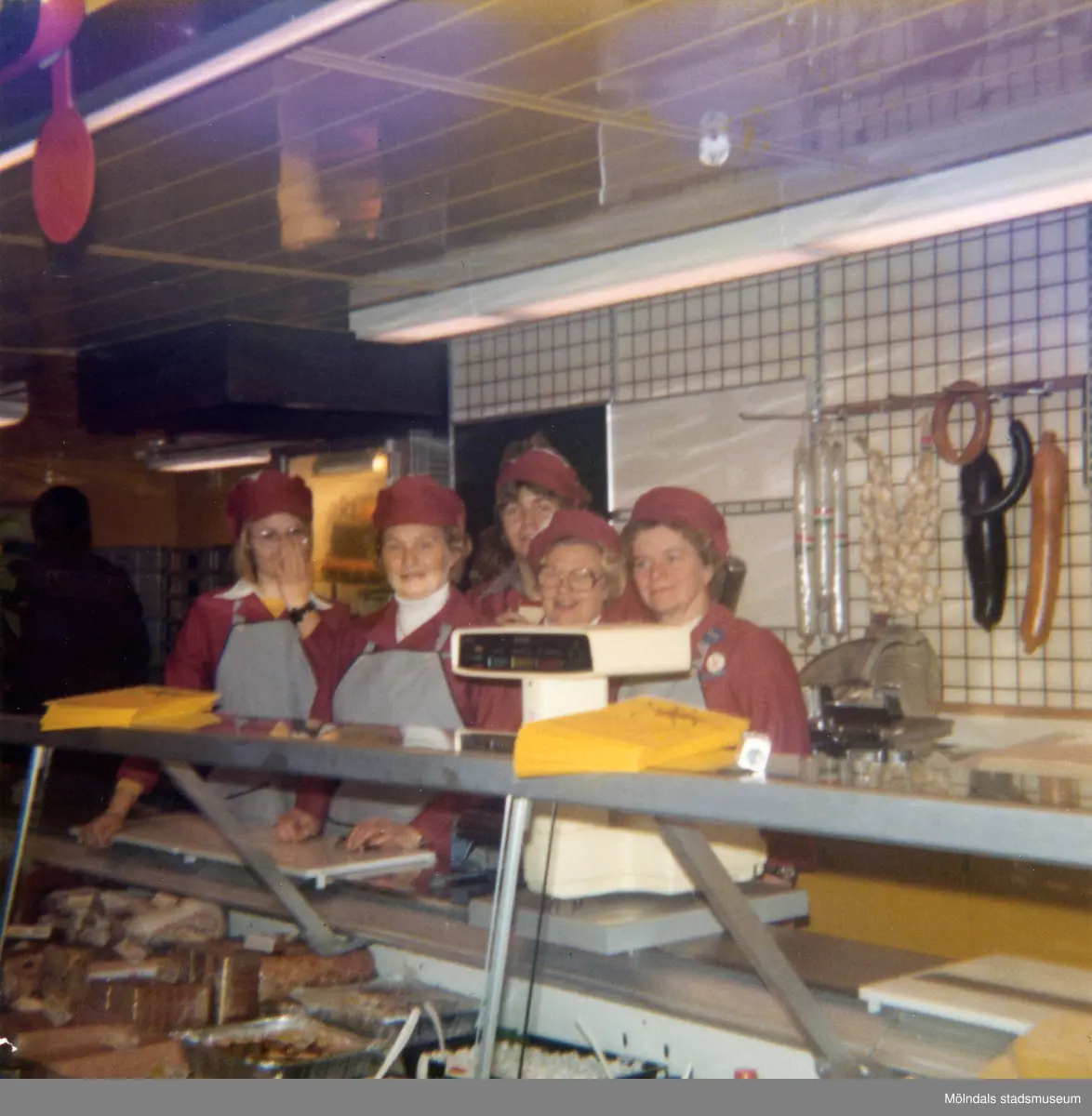 Fem kvinnor, klädda i röda rockar med hättor och grå förkläden, står innanför charkavdelningen, Domus Mölndal C 1976.