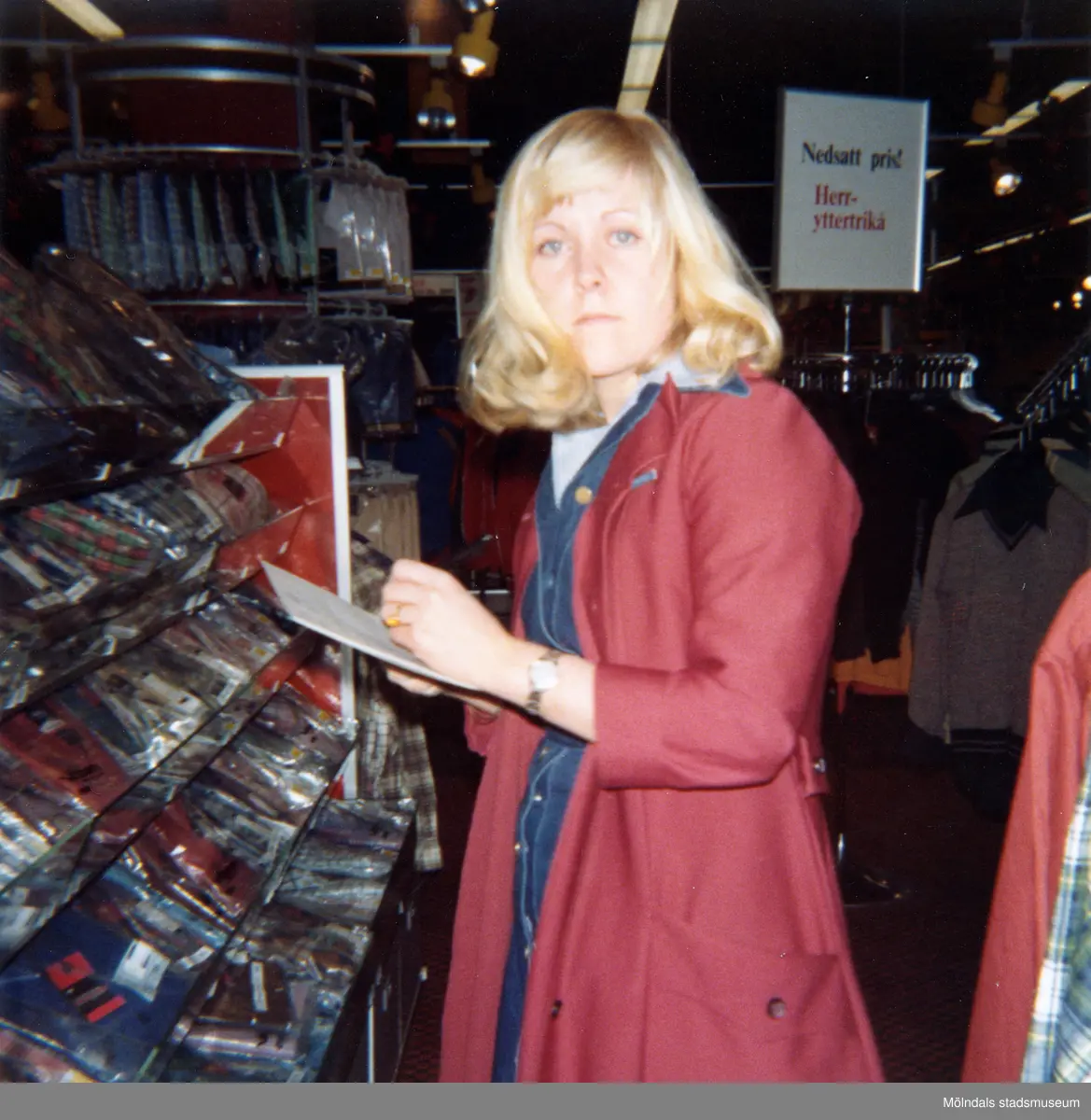 En kvinnlig expedit, klädd i röd rock, står i klädavdelning med papper och penna i handen, Domus på Frölundagatan efter 1976.
