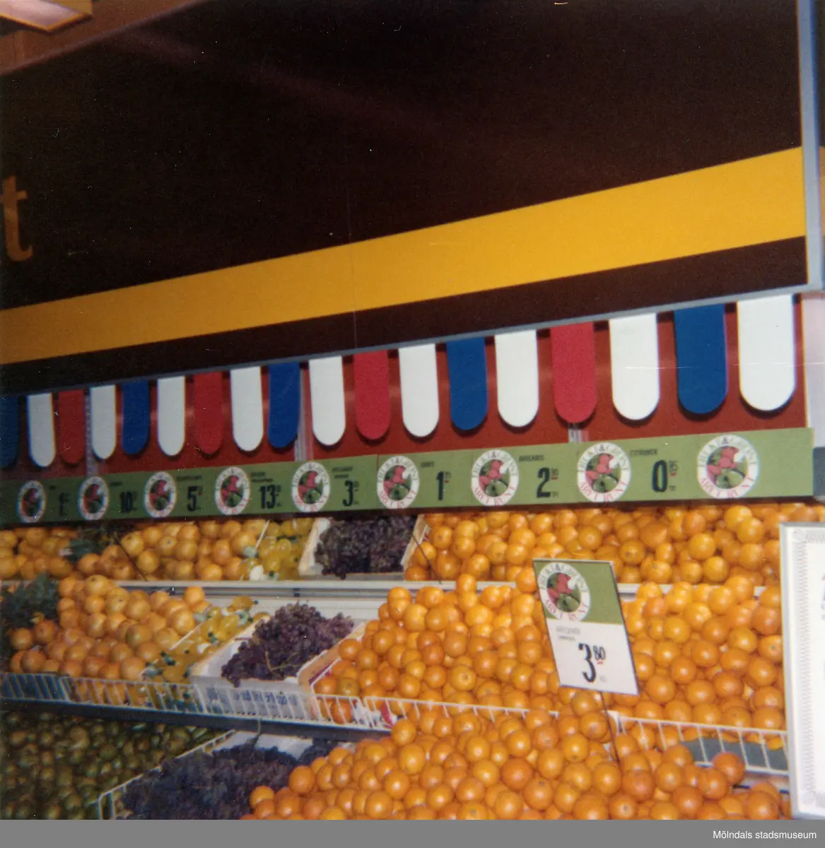 En väggmonterad hylla fylld med olika slags frukt, Domus Mölndal C efter 1976.