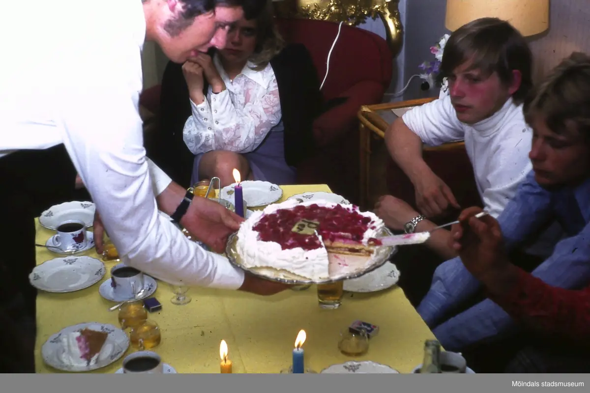 Tårtkalas hemma hos familjen Thörnqvist i Lindome, okänt årtal. Soffbordet är uppdukat med tända ljus och kaffeservice av finporslin. En man lutar sig fram över bordet och håller en tårta i händerna. Han bjuder två ungdomar att ta för sig.
