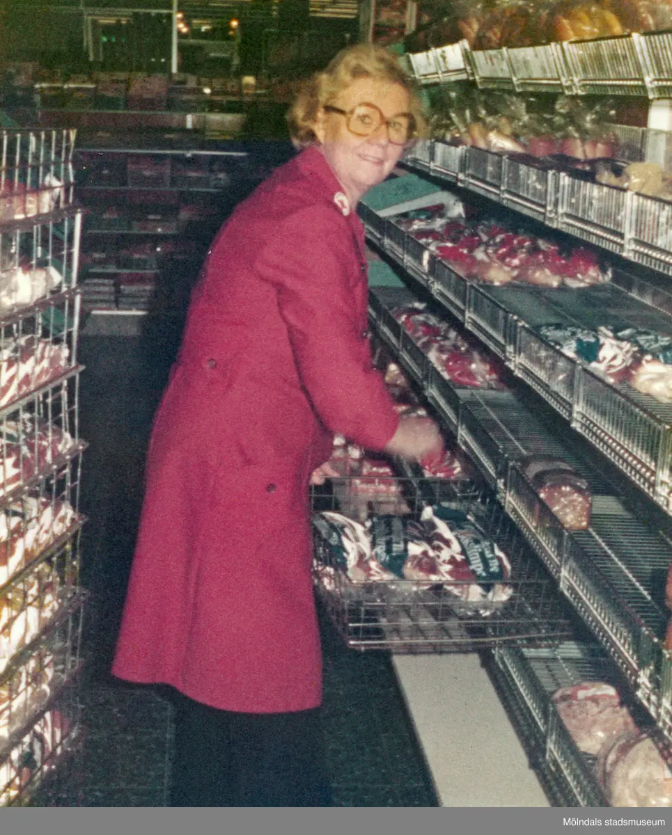 Berit Thörnqvist, klädd i röd rock, packar upp bröd i brödavdelningen, Domus Mölndals C efter 1976.