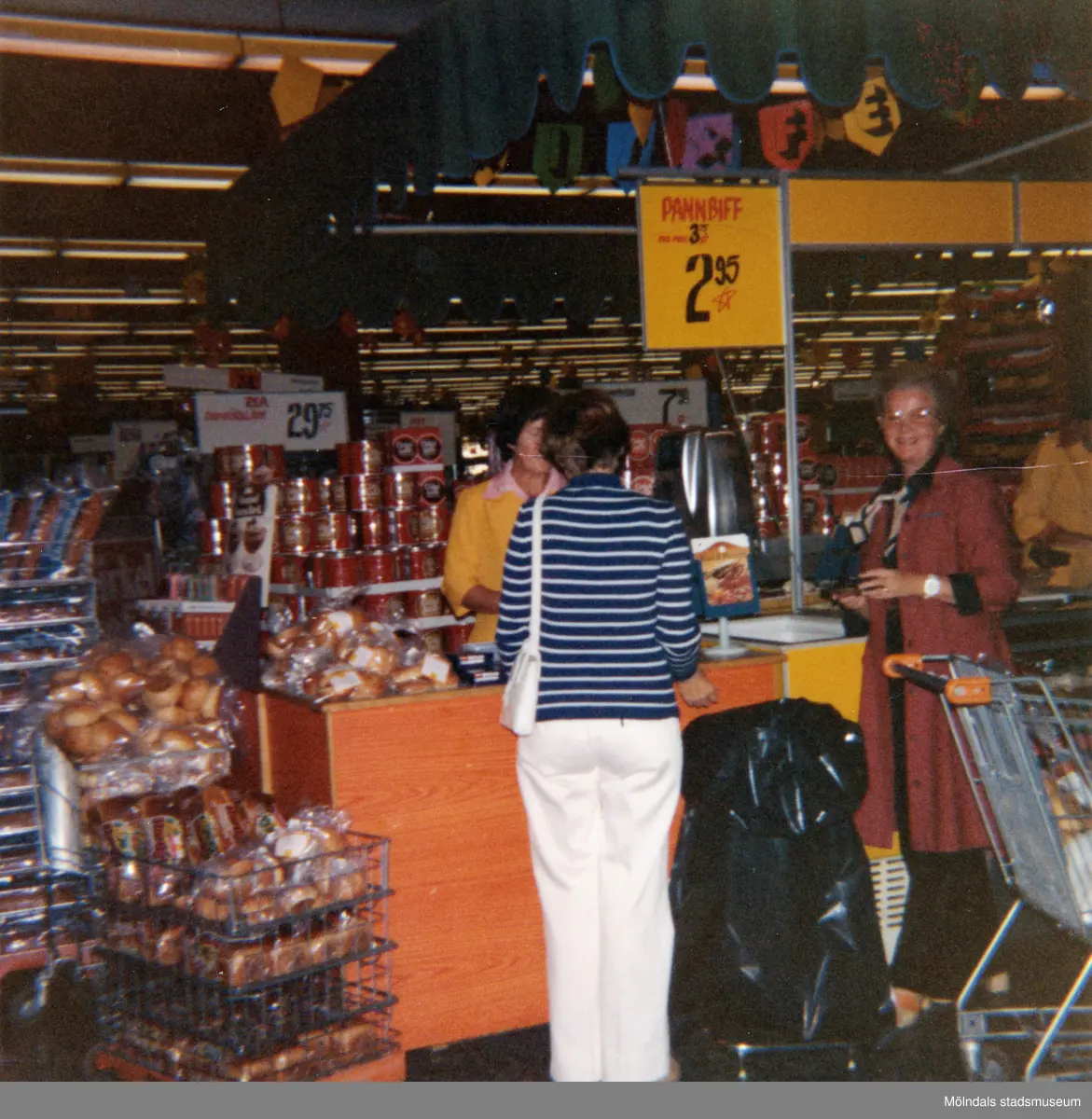 En kvinnlig demonstratris, klädd i gul rock, står vid en disk för provsmakning av bröd, Domus Mölndal C efter 1976. En kund och en expedit står framför disken. I bakgrunden ses stora, runda, uppstaplade aluminiumburkar med Cirkelkaffe.