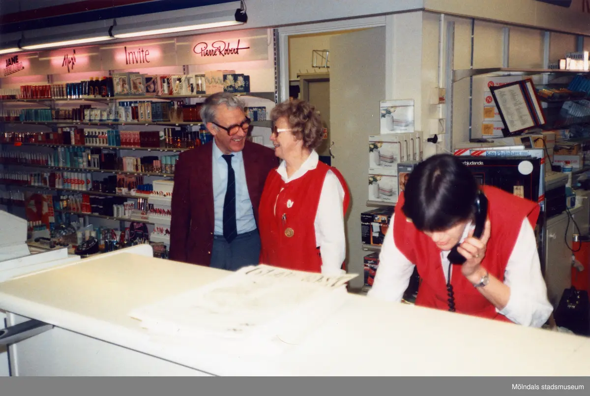 En man klädd i kavaj och slips, samt två kvinnliga expediter klädda i röda rockar, står innanför en disk, K-marknad Mölndals Centrum från 1986. I bakgrunden till vänster ses kosmetikaprodukter (Jane Hellen, Maxi, Invite och Pierre Robert) uppställda i hyllorna.