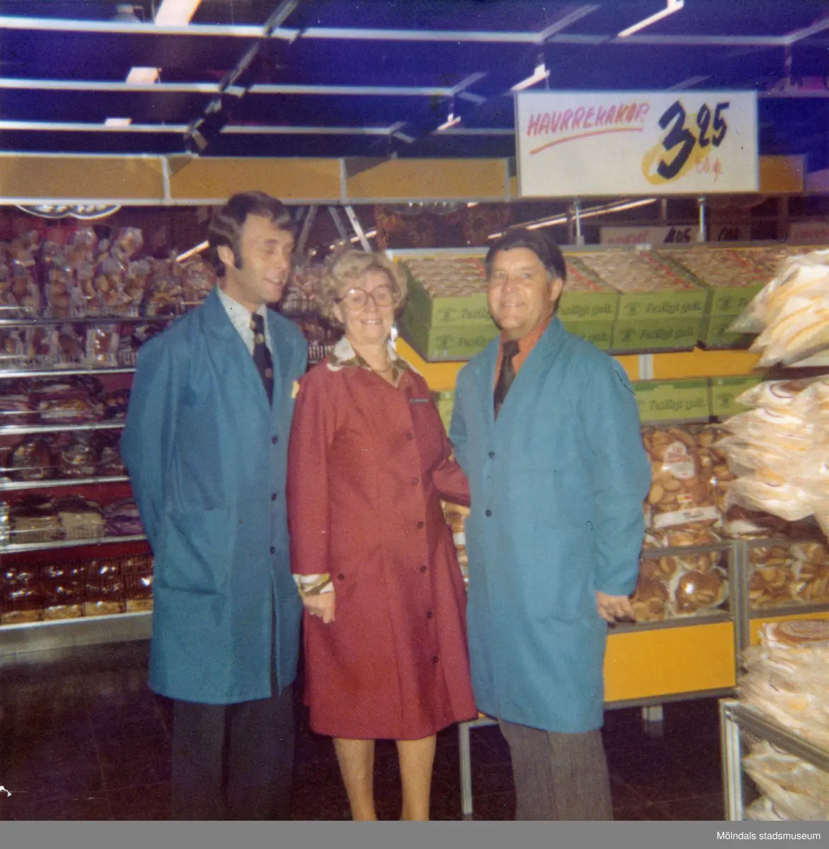 Tre personer står vid brödavdelningen, Domus Mölndal C 1976. Från vänster: Jan-Olof Standar (klädd i blå rock), Berit Thörnqvist (klädd i röd rock) och Kurt Ericsson (klädd i blå rock). Vid sidan av hänger en skylt i taket med texten "HAVREKAKOR 3,25".