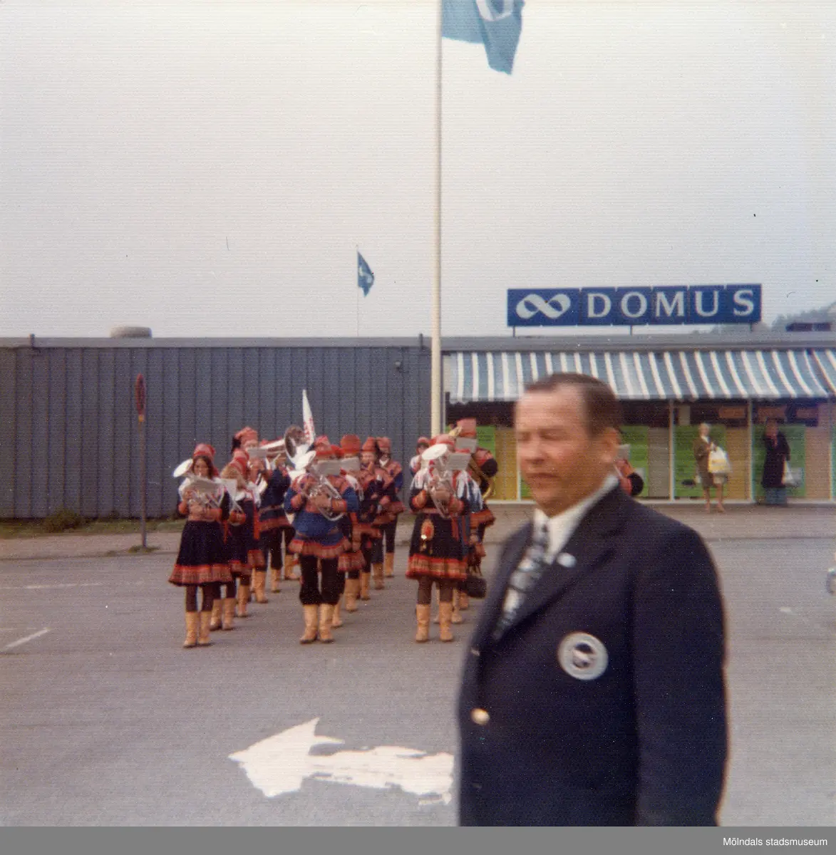 Främst ses en man, iklädd slips och blå kavaj, som står på en parkeringsplats utanför Domus, Nya torget före 1976. Bakom honom står en grupp sameklädda personer och spelar intstrument. I bakgrunden ses Domus som ligger i en blå barack-byggnad.