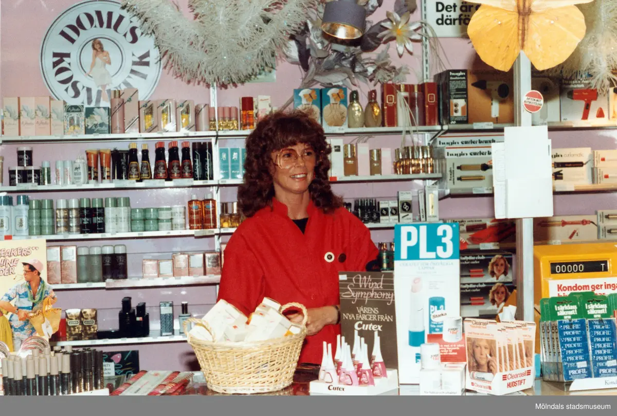 En kvinnlig expedit, klädd i röd rock, står i kosmetikavdelningen, Domus Mölndal på Frölundagatan som invigdes 1976. På disken framför expediten finns mascaror och nagellacker från Cutex, PL3-cerat, Clerasil täckande stift samt Profil-kondomer till försäljning. I bakgrunden ses varor i hyllorna. Ovanför sitter en skylt med texten "Domus kosmetik".