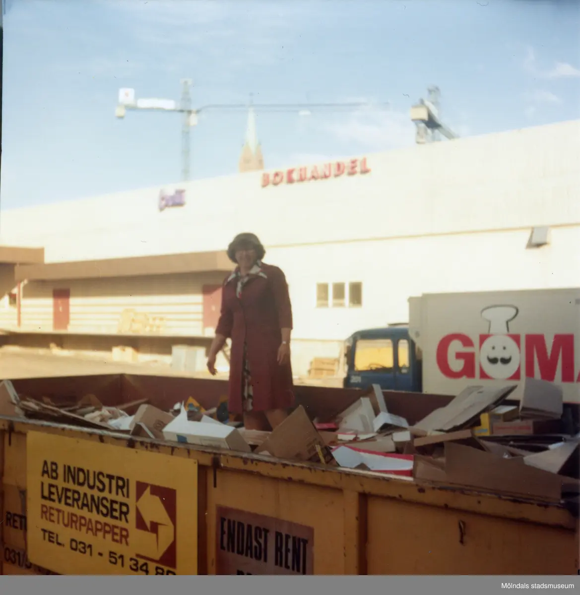 En kvinnlig expedit, iklädd röd rock, står utomhus mitt i en stor gul papperskontainer, Domus Mölndals C okänt årtal. På kontainern står textat AB INDUSTRILEVERANSER RETURPAPPER Tel. 031-51 34 80. I bakgrunden ses en Goman-lastbil samt ett hus (lastkaj) med texten BOKHANDEL. Längre bort skymtar två byggkranar och kyrktornet till Fässbergs kyrka.