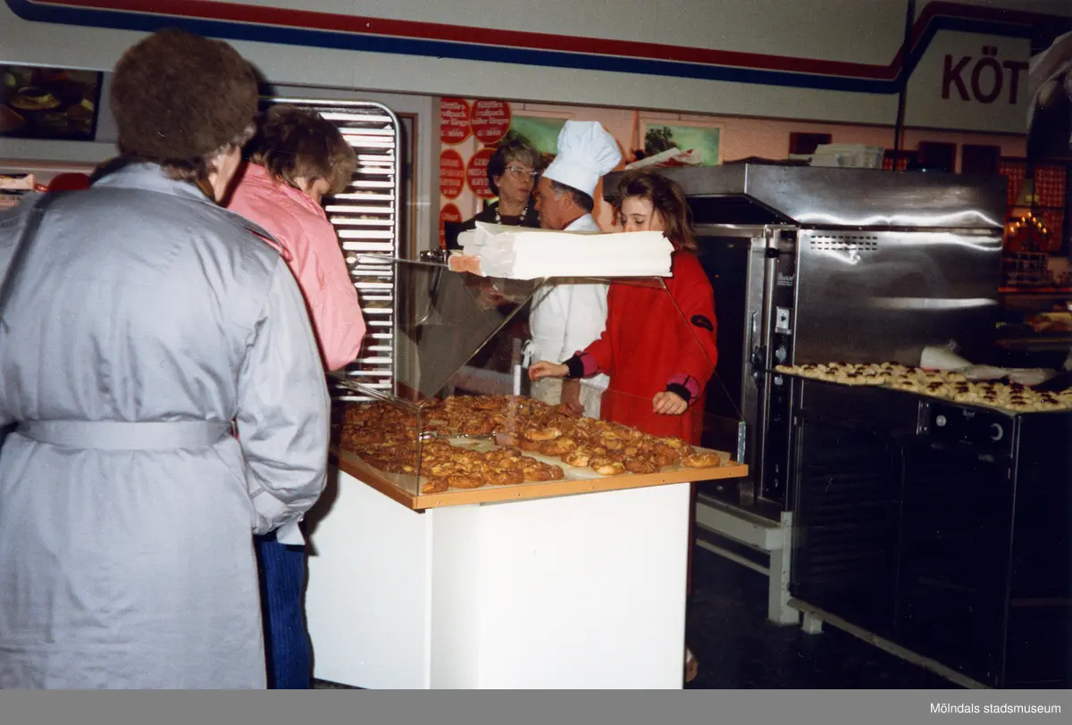 En disk med nybakade wienerbröd står uppställd i butiken. Innanför disken står en kvinnlig expedit klädd i röd rock och en manlig bagare klädd i vitt. Bredvid kocken står en kvinna. I bakgrunden ses en stor ugn samt plåtar med förberedda bakverk som ska in i ugnen. Två kvinnliga kunder står framför disken och tittar på de nygräddade wienerbröden, K-marknad efter 1985/86.