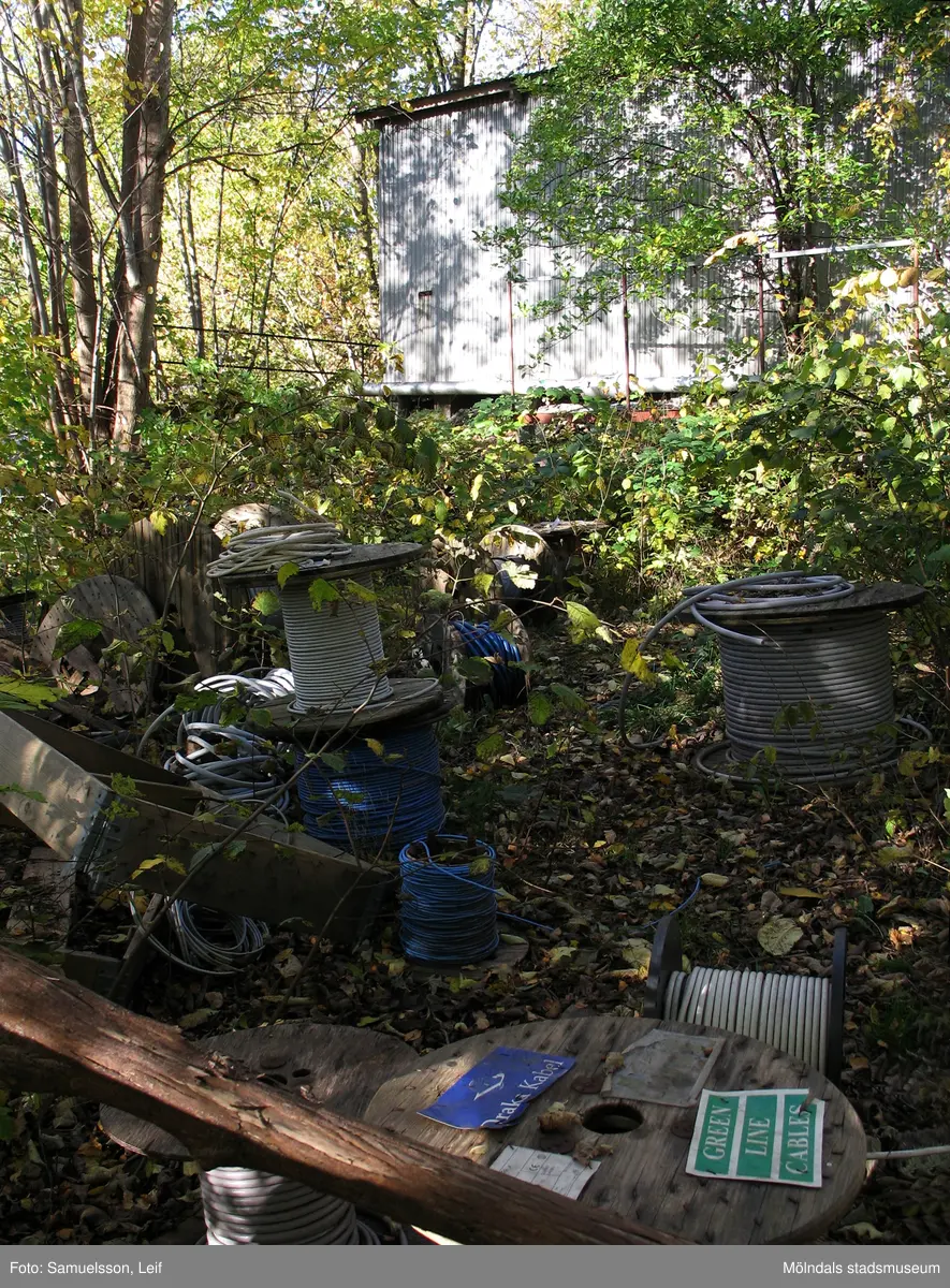 Framför ett plåtskjul ligger kabeltrummor och andra föremål i naturen vid Soabs industrianläggning i Mölndals Kvarnby, år 2007. Anläggningen användes vid fototillfället av Hexion Speciality Chemicals Sweden AB.