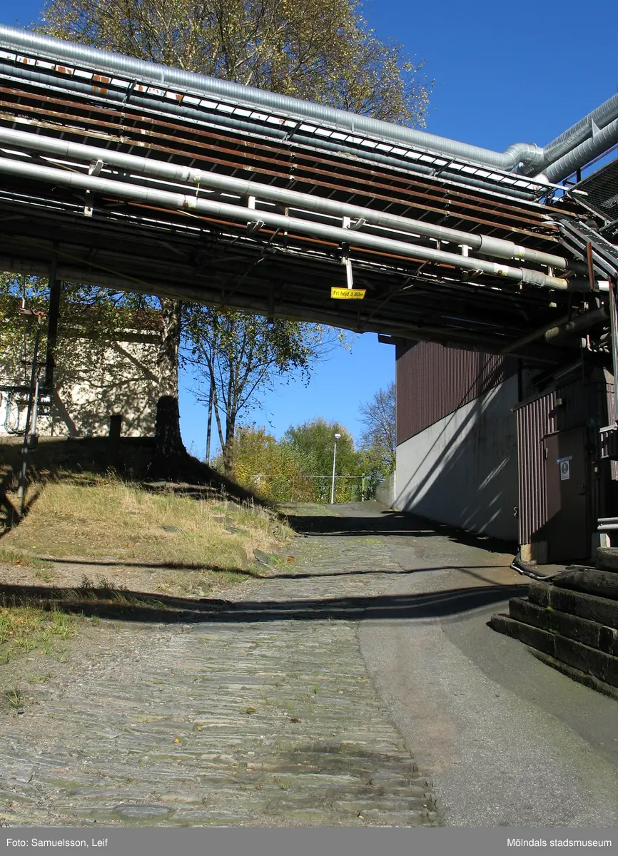 Titel: Äldre stenbelagd väg intill byggnader vid Soabs industrianläggning i Mölndals Kvarnby, år 2007. Över vägen löper en mängd rörledningar. Anläggningen användes vid fototillfället av Hexion Speciality Chemicals Sweden AB.