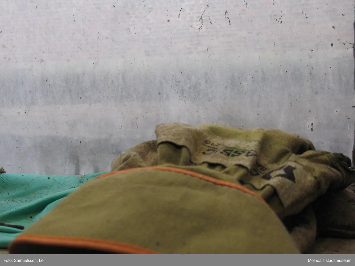 Ett par arbetshandskar ligger vid ett fönster. Interiörfotografi från byggnad vid Soabs industrianläggning i Mölndals Kvarnby, år 2007. Anläggningen användes vid fototillfället av Hexion Speciality Chemicals Sweden AB.