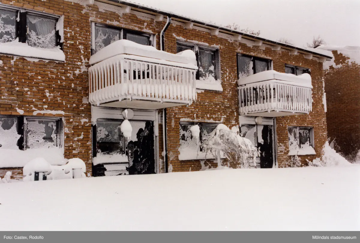 Titel: Snödrivor vid bostadshusen på Höjdgatan i Stensjöbacke, Mölndal, efter snöstormen den 17 november 1995.