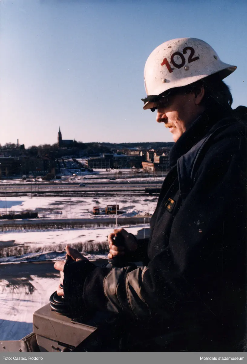 Mölndals brandstation i Trädgården, Mölndal, på 1980-talet. En brandman manövrerar brandbilens lift med hjälp av spakar. I bakgrunden ses Fässbergs kyrka, stadshuset och Folkets hus.