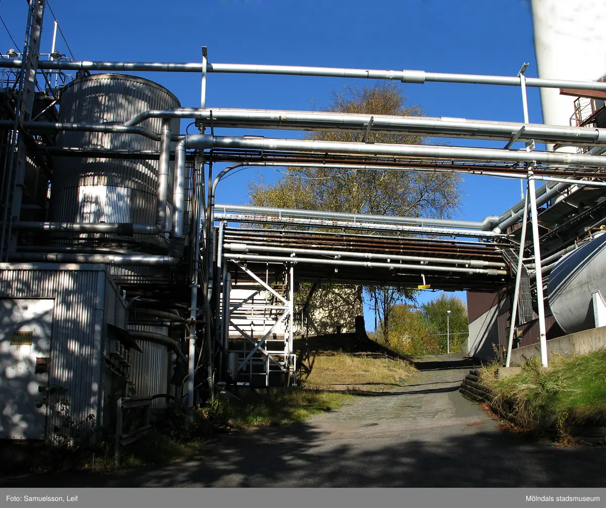 Äldre stenbelagd väg intill byggnader vid Soabs industrianläggning i Mölndals Kvarnby, år 2007. Över vägen löper en mängd rörledningar. Anläggningen användes vid fototillfället av Hexion Speciality Chemicals Sweden AB.