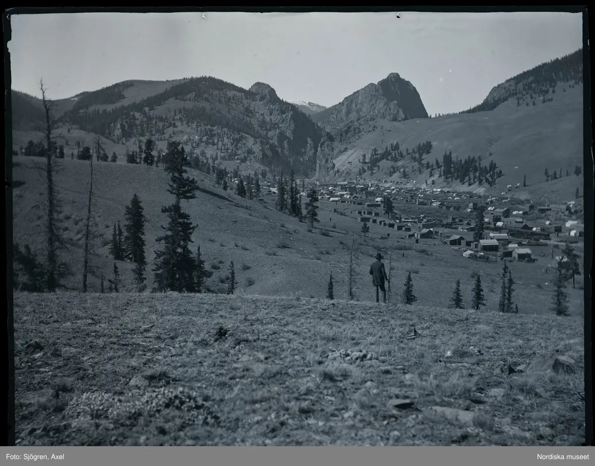 En man står och blickar ut över ett bergigt landskap och bebyggelse. Colorado, USA.
