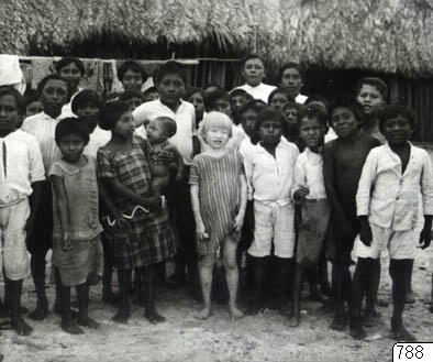 En albinoflicka bland normalpigmenterade barn. Byn Kuepbí, San Blas, Panama. Se E. Nordenskiöld: Indianerna på Panamanäset, Sthlm 1928, bild 143. Bildark: 4424. Neg. nr: 1130.