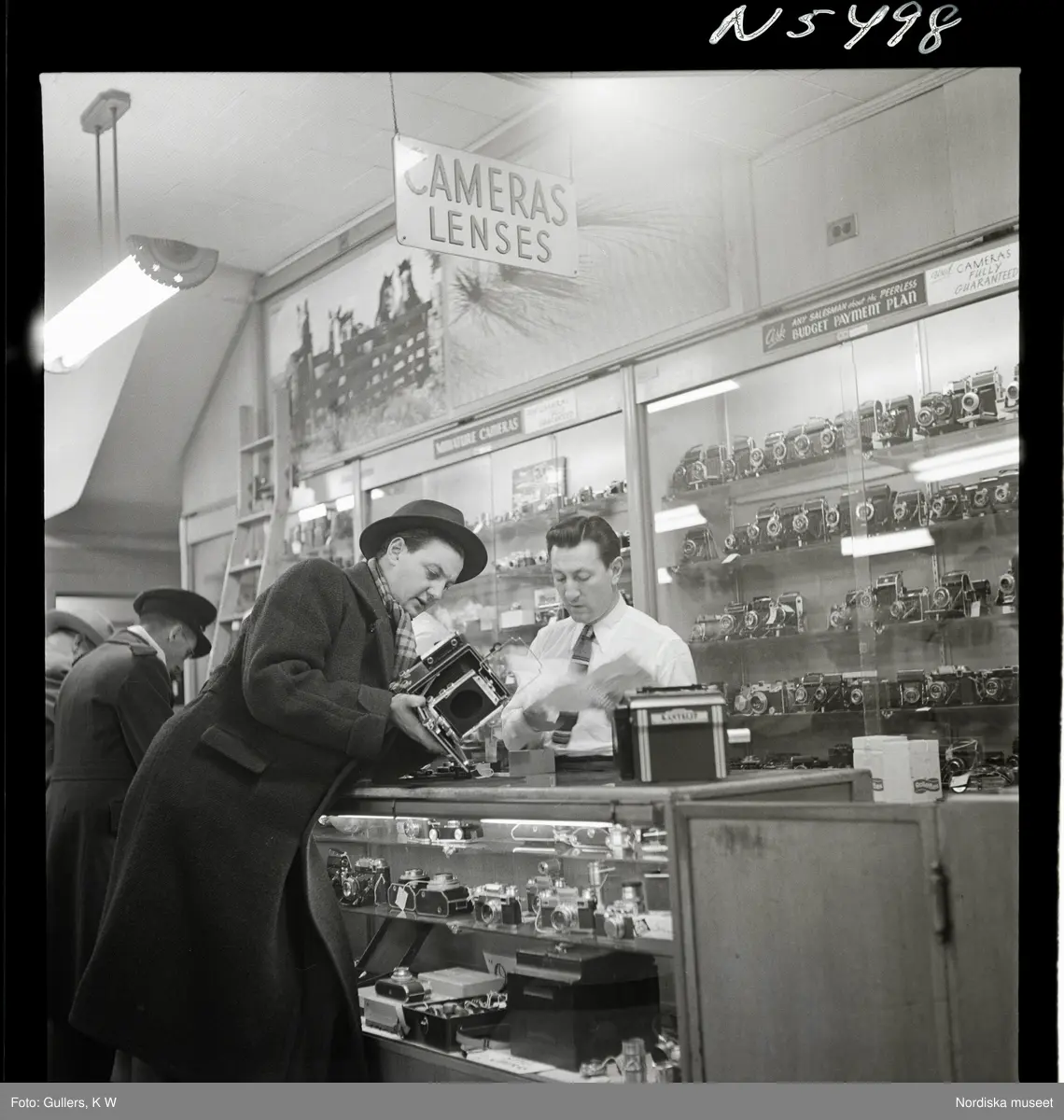 Titel: 1690 New York allmänt (N.Y. Herald Tribune). K W Gullers blir visad en kamera av en expedit i butik.