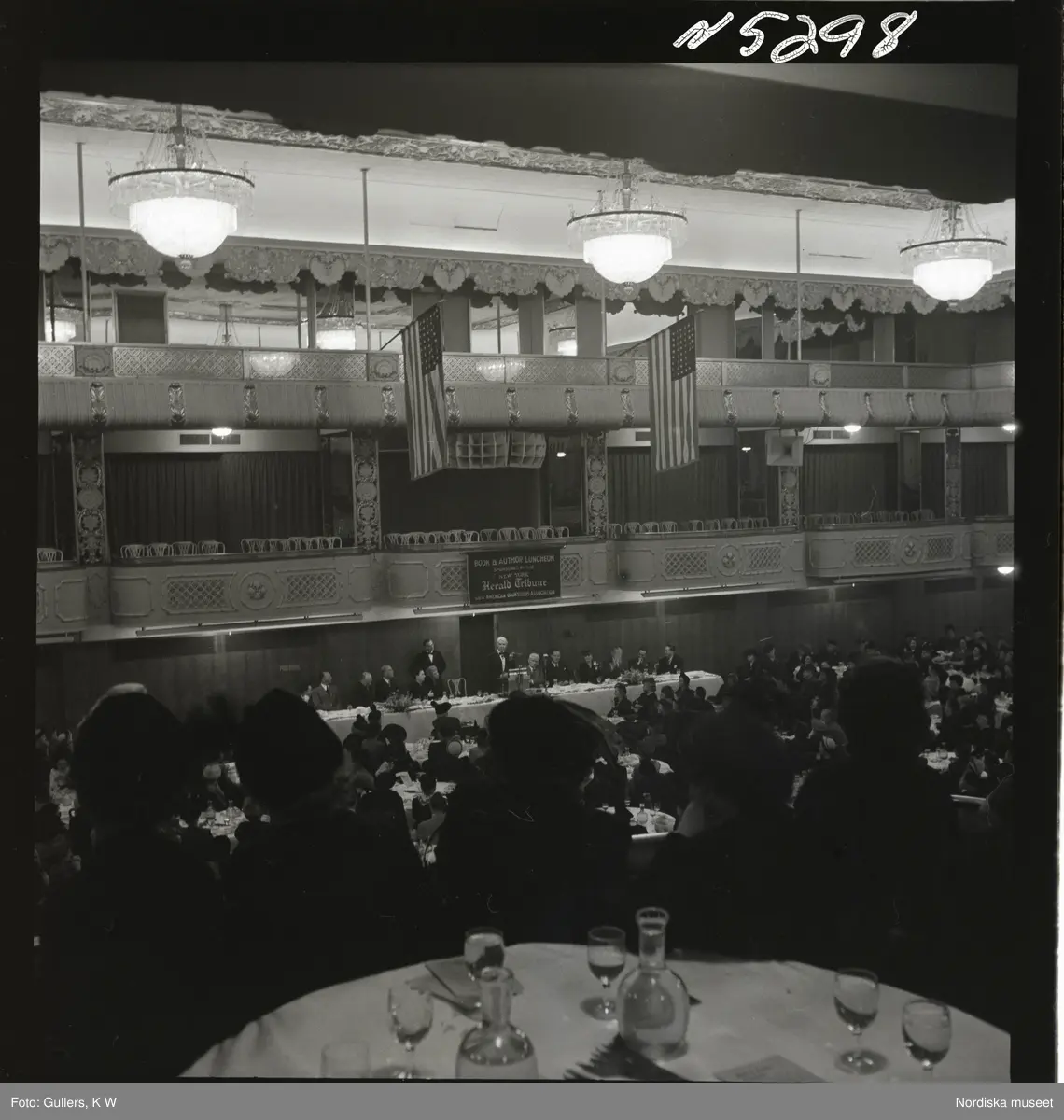 Titel: 1690 New York allmänt (N.Y. Herald Tribune). Publik vid Herald Tribunes bok- och författar-lunch lyssnar på ett anförande.