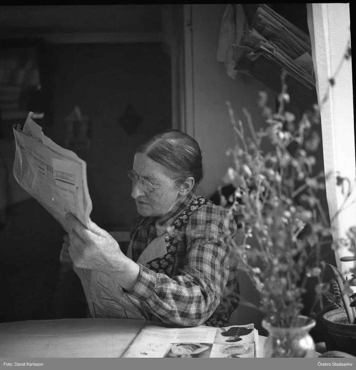 David Karlssons mor Maria läser tidning i huset i Karlstorp, 1930-tal