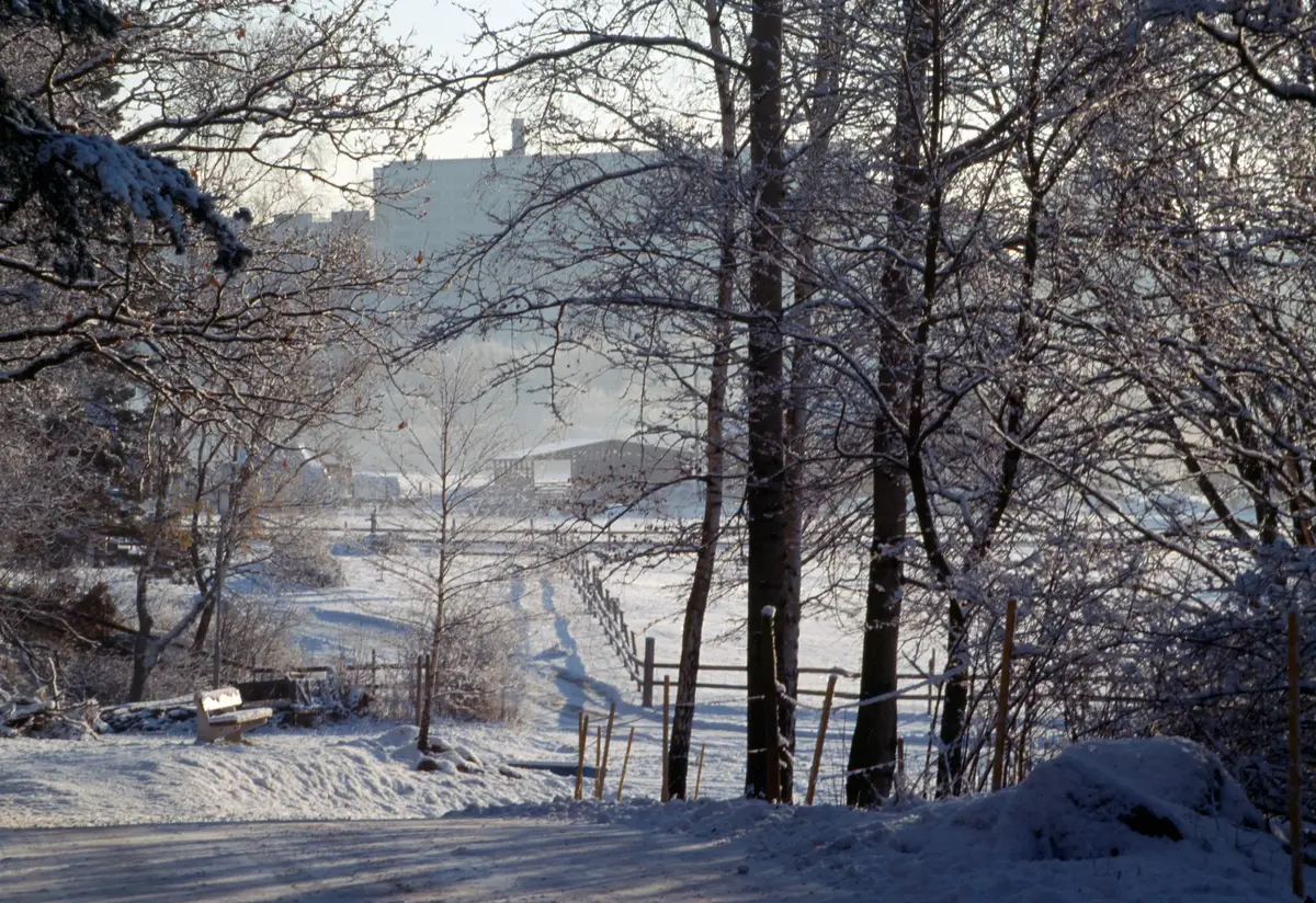 Vintermotiv med utsikt över Rönninge by och Hägernäs i bakgrunden