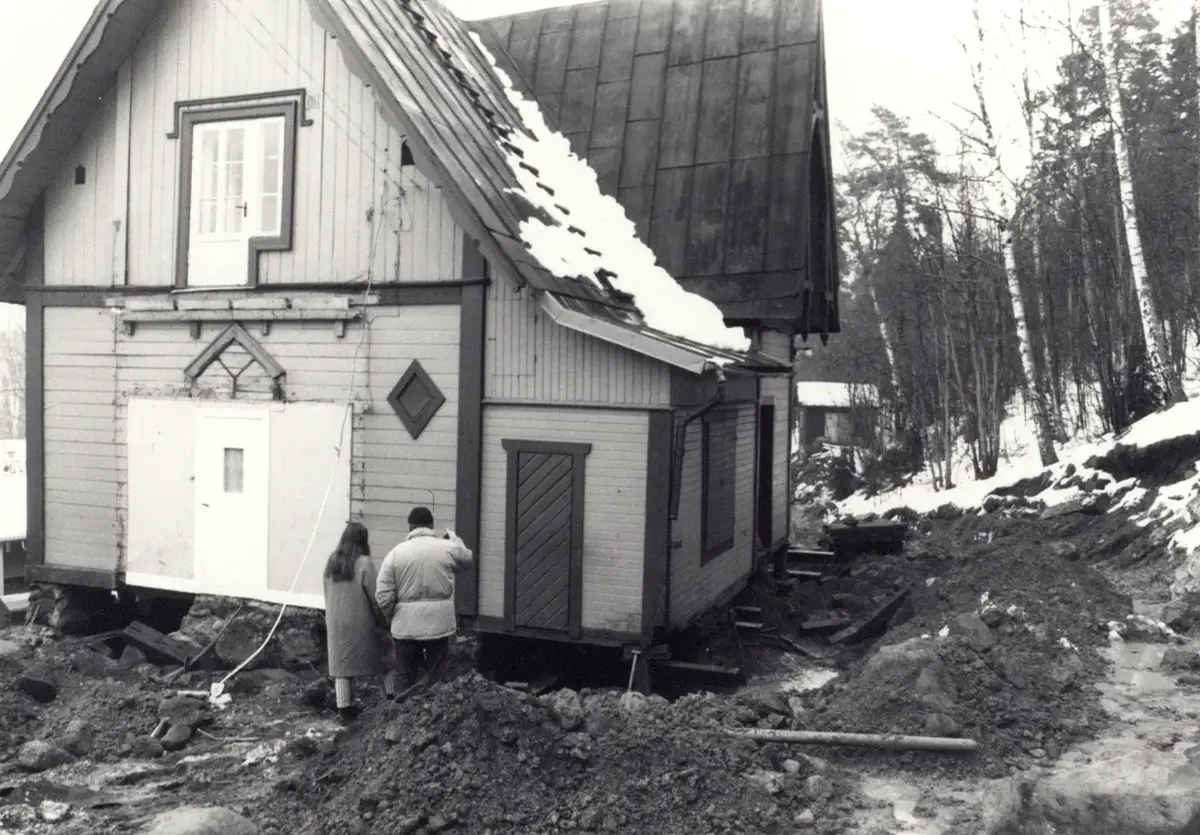 Hembygdsgårdar. Flyttning av Ingarö hembygdsmuseum vintern 1988.