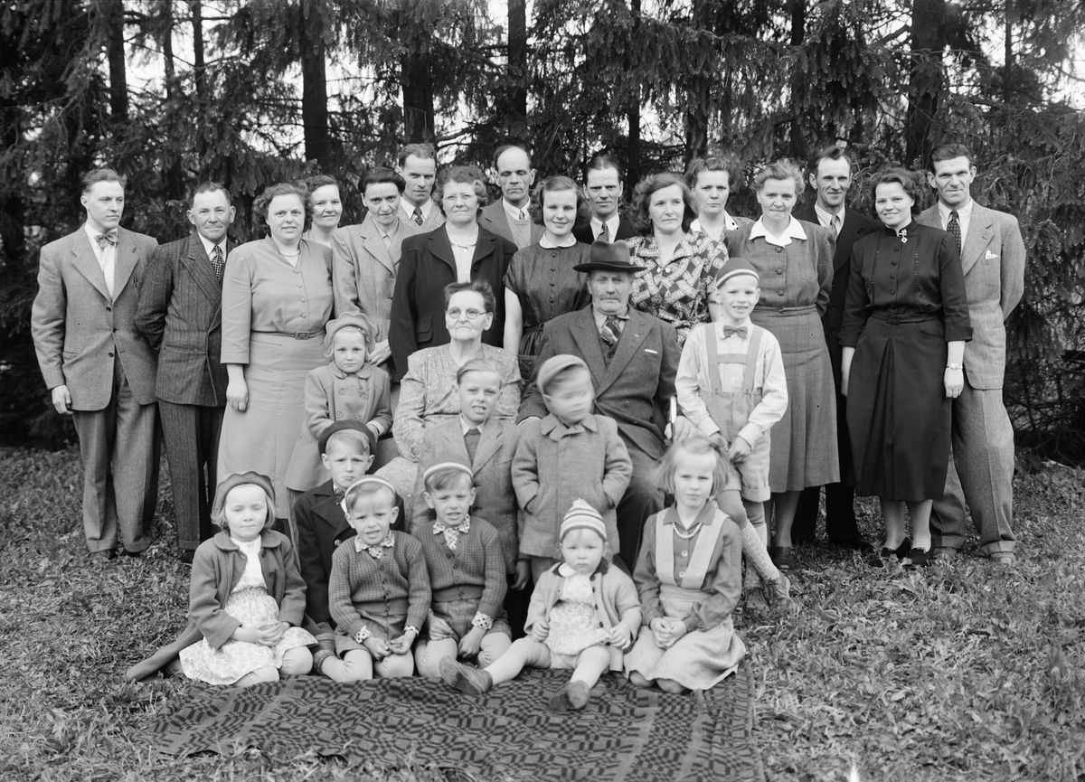 Grupporträtt i trädgården med Viktor Andersson, Västerdal, Tuna socken, Uppland