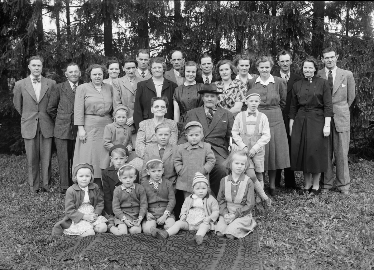 Grupporträtt i trädgården med Viktor Andersson, Västerdal, Tuna socken, Uppland