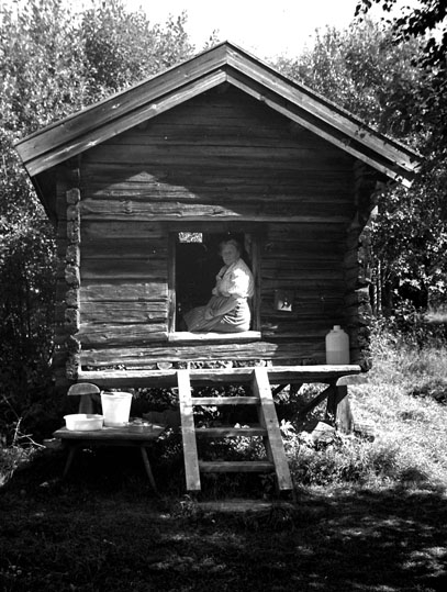 En kvinna sitter i dörröppningen till ett härbre.