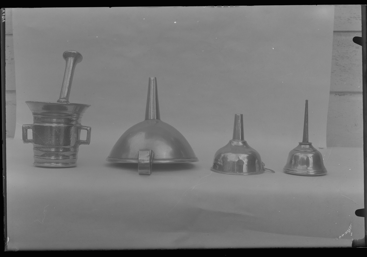 Mortel, tratt och oljekanna av mässing.