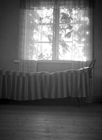 Foto taget innifrån mot fönstret där en klängväxt täcker fönstret.