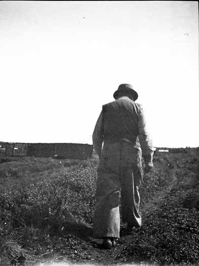 Porträtt bakifrån av en man i overall som vandrar stigen fram.