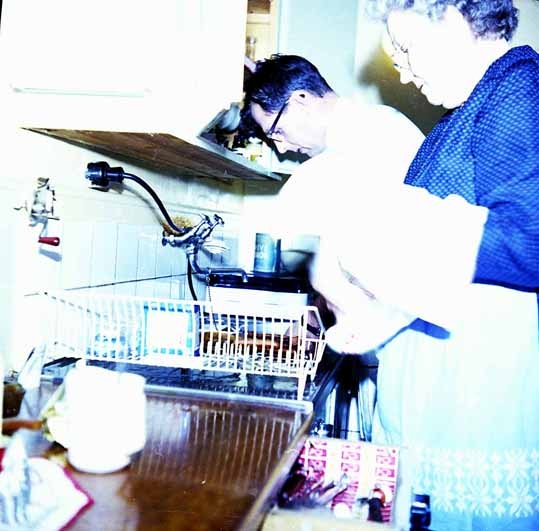 Mannen diskar och kvinnan torkar.