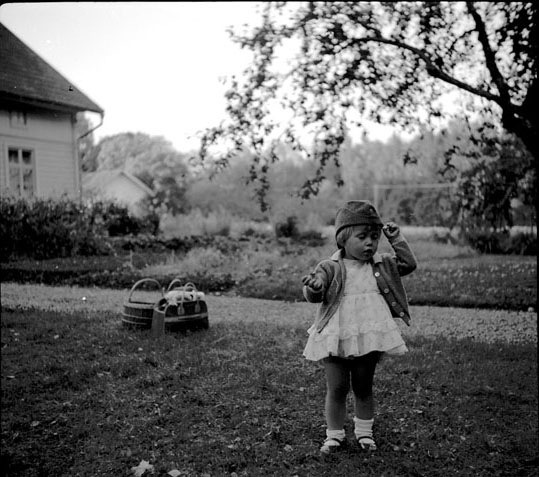 En liten flicka i trädgården.