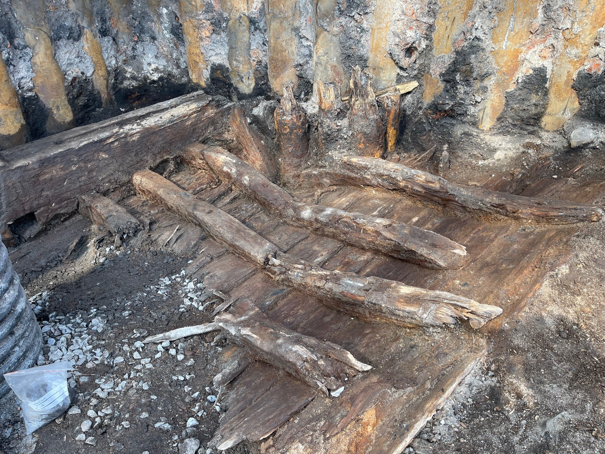 Fyra pålar syns högst upp i bilden. Dessa är sekundära. På bilden syns även bottenstockar samt det grova kölsvinet
