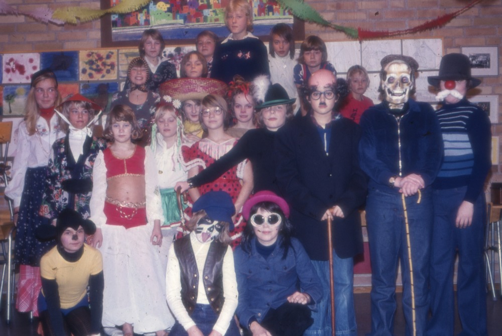 Bilden från klass 5 vt 1977. Bilden föreställer ett grupporträtt på barn, elever, i maskeradkläder. De står i ett klassrum.