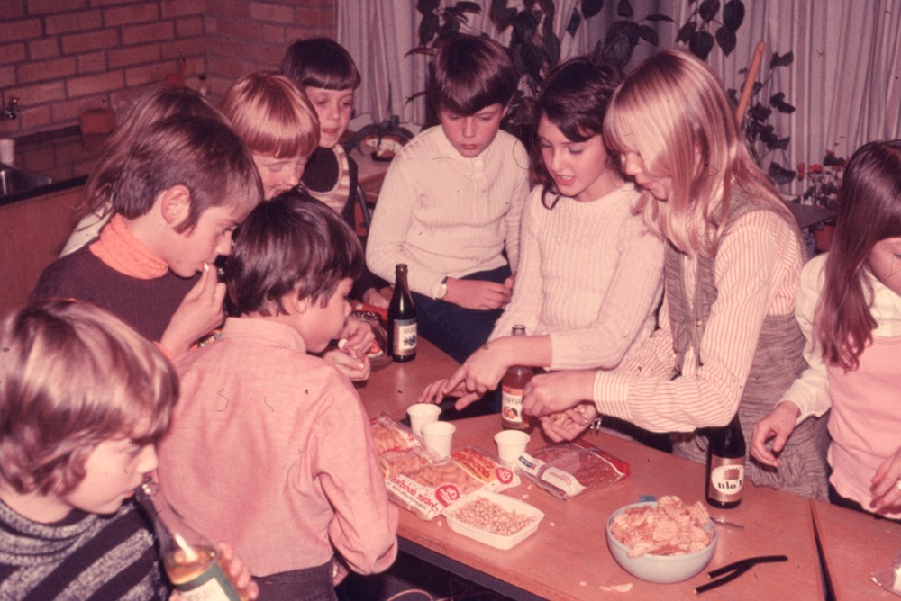 Bilden är från klass 5 ht 1976. Bilden föreställer barn i ett klassrum möblerat för fest. Nio barn samlade vid ett bord med läskedrycker och ostkrokar, chips och jordnötter. [osäkert]