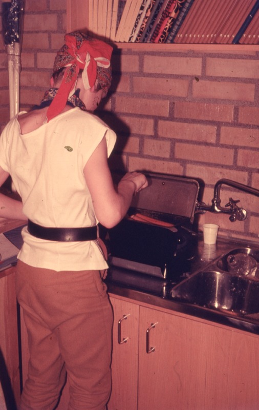 Bilden föreställer klassfest, klass fyra vt 1970. Ett barn utklätt, med ryggen mot kameran, vid en diskbänk vid ett fat med korvar.