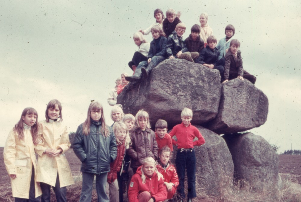 Bilden är från Hembygdsrunda med klass 4 ht 1972. Bilden föreställer klassen vid sidan av och uppklättrad på stenar, troligen fornlämning av något slag, Gantofta dösen.