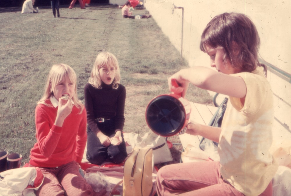 Bilden är från Hembygdsrunda med klass 4 ht 1972. Bilden föreställer tre barn på en filt med väskor. Dem äter troligen matsäck.