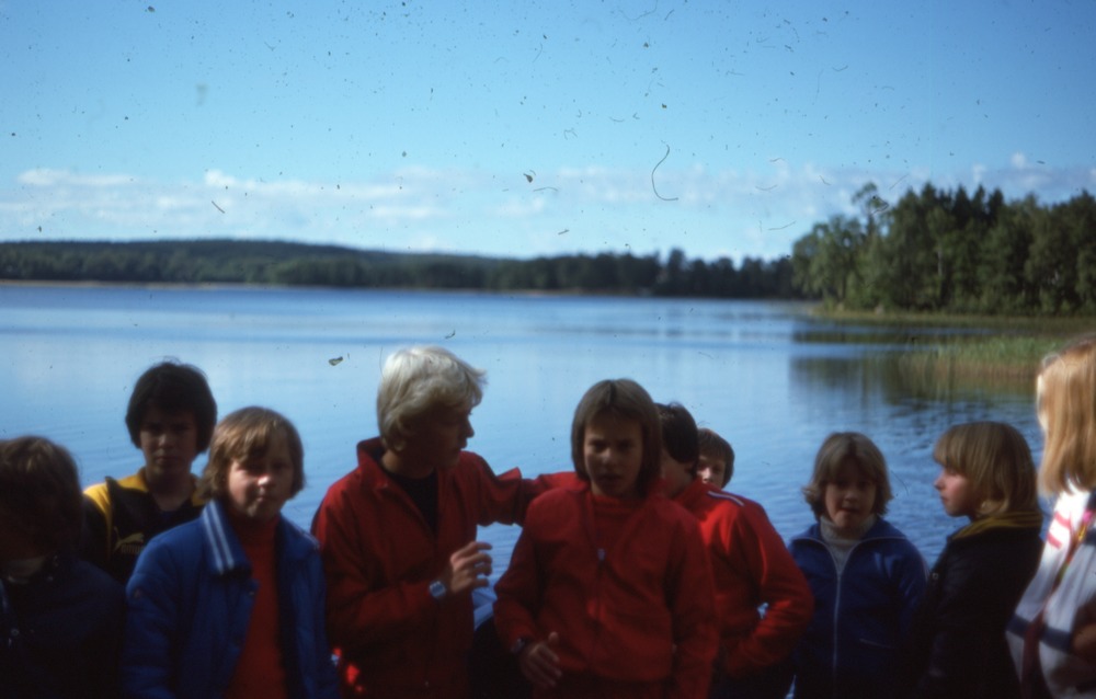 Bilden är från Klass 6 Lägerskola Hj 1977. Bilden föreställer en grupp barn i halvformat framför en sjö, skog i bakgrunden.