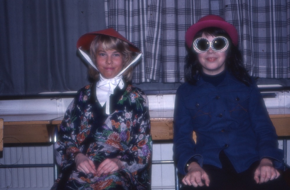 Bilden från klass 5 vt 1977. Bilden föreställer ett porträtt på två barn, elever, i maskeradkläder. De sitter i ett klassrum.