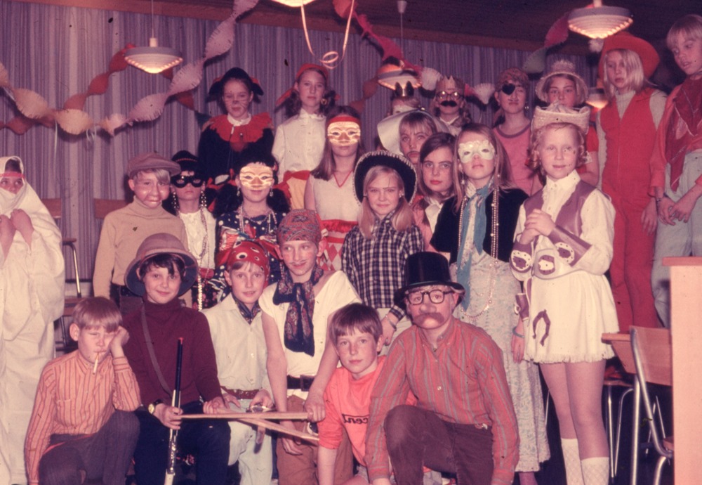 Bilden föreställer klassfest, klass fyra vt 1970. Omkring tjugo barn utklädda, uppställda för grupporträtt i festpyntad skolsal.