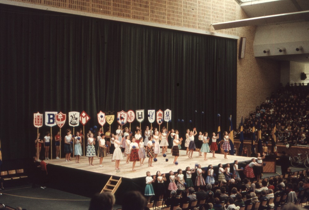 Bilden föreställer Skol J.F. 40 år, 1961. På bild en scen i en gymnastiksal framför svart drapperi. På scenen står flickor i kjol. Bakre raden har vapensköldar. I höger kanten åskådare.