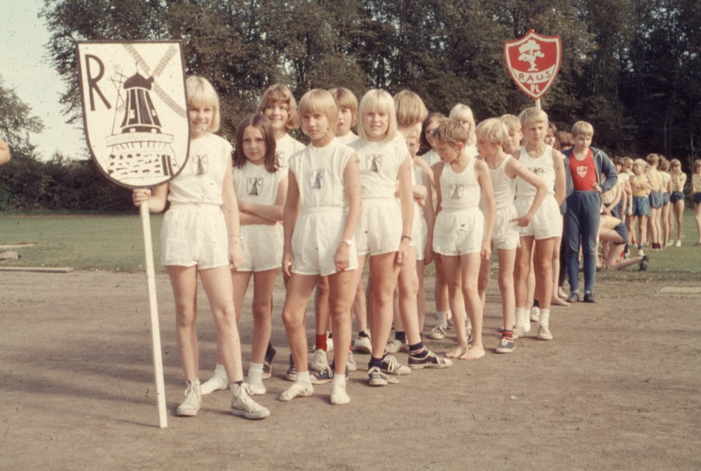 Bilden föreställer först en rad med flickor och pojkar i vita linne och vita shorts. Den första flickan håller i en vapensköld med en mölla på och bokstaven R. Bakom dem en rad med pojkar i vita linnen och blåa shorts också med en vapensköld med ett vitt träd på röd botten samt texten Raus PL. Alla står på grusad yta och gräsmatta. I bakgrunden träd. På bilden står det klass 4.