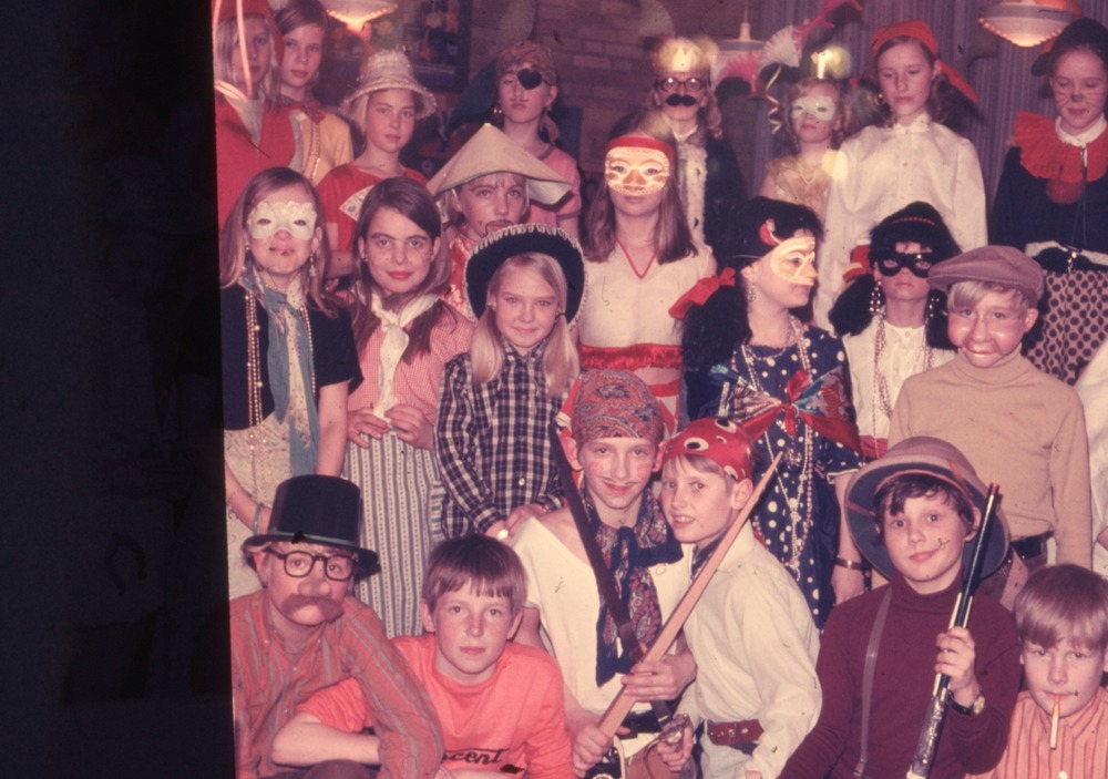 Bilden föreställer klassfest, klass fyra vt 1970. En grupp utklädda barn, drygt tjugo stycken uppställda för grupporträtt.