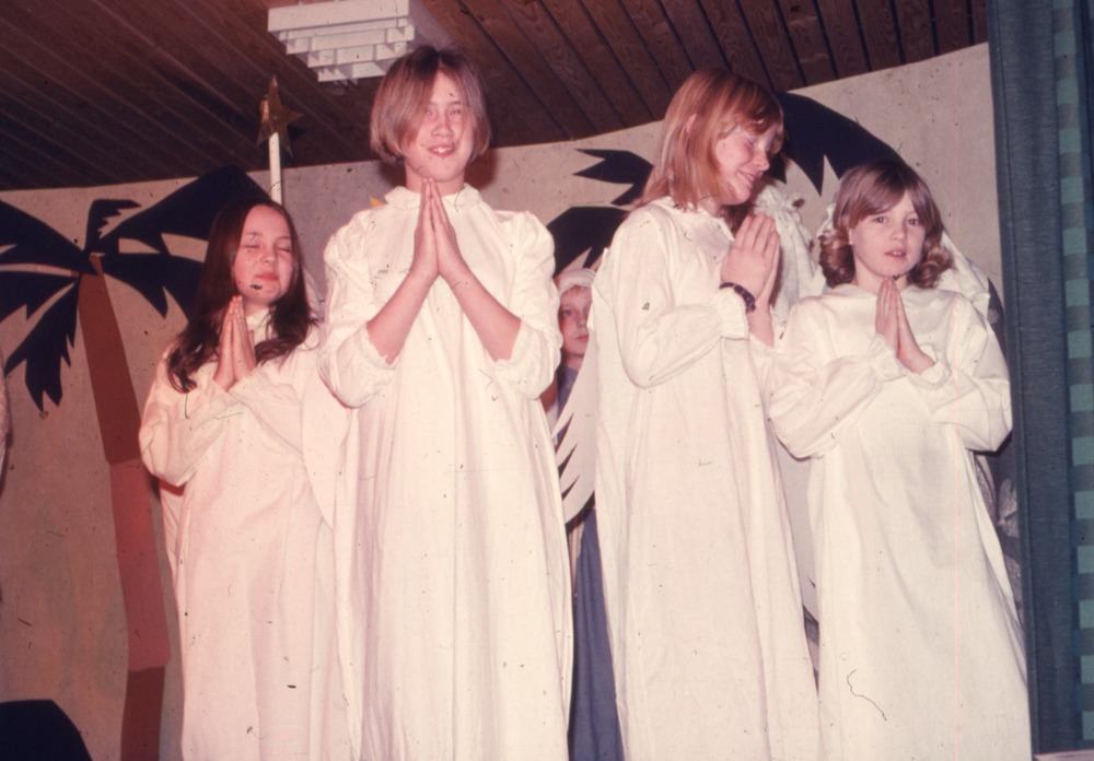 Bilden föreställer en teaterföreställning där barn spelar ett julspel, historien om Jesufödelse. Fyra änglar. På fotot står det julen 1967, klass 5.