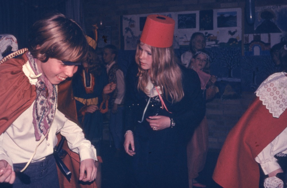 Bilden föreställer enligt register klassfest klass 6 vt 1969. Två barn i maskeraddräkt i halvformat.