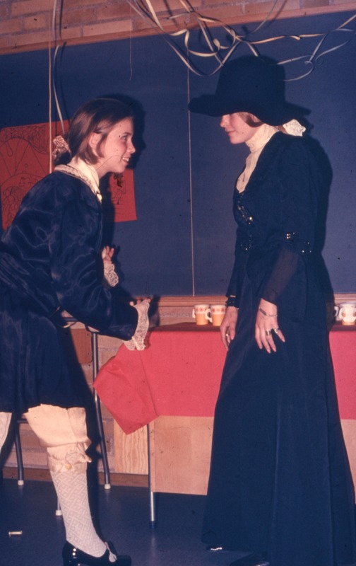 Bilden föreställer enligt register klassfest klass 6 vt 1969. Två flickor i maskeradklädsel.
